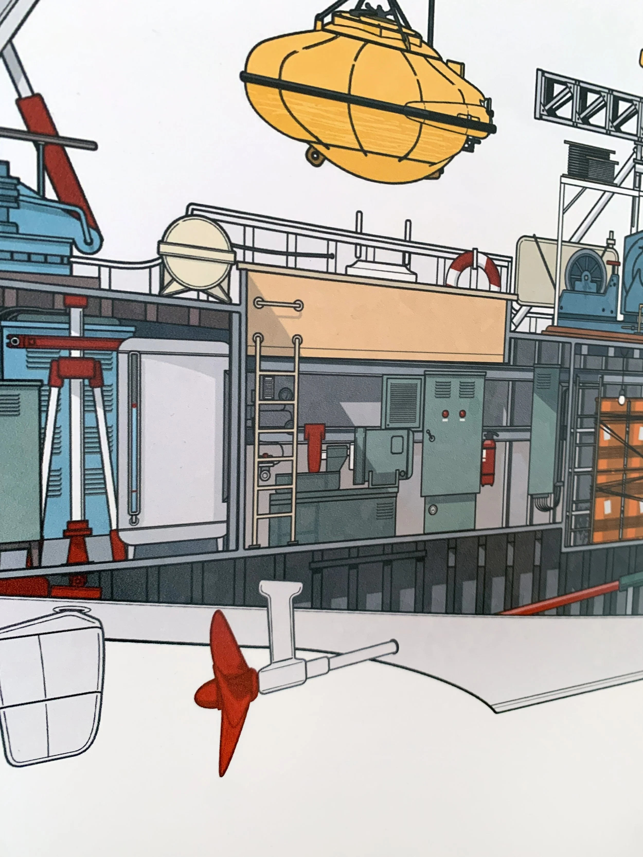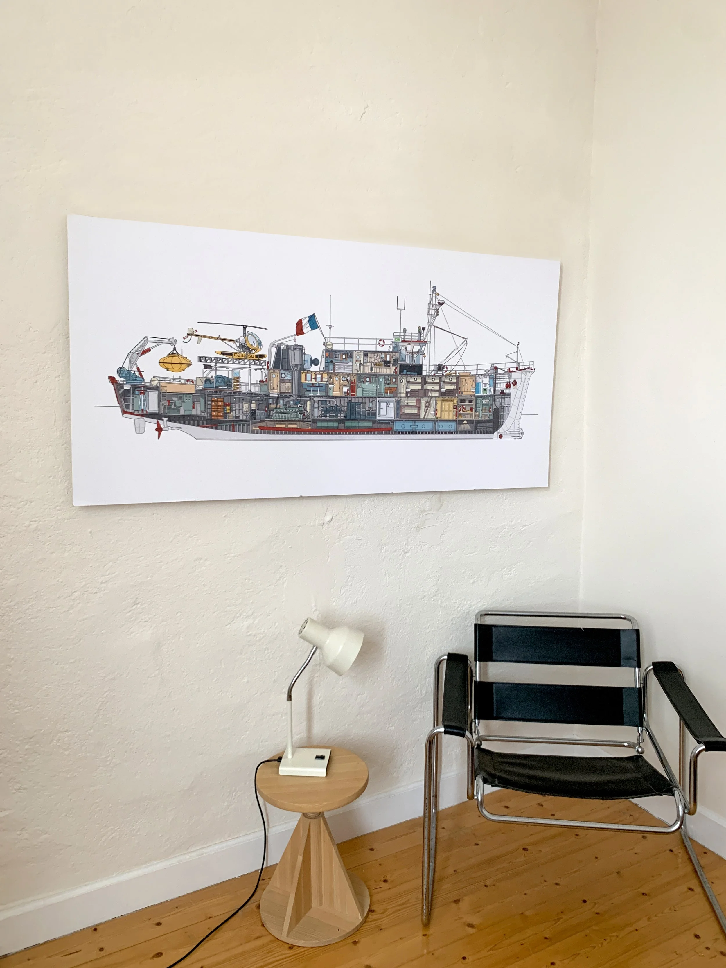High quality art print with detailed illustration of Jacques Cousteau's research ship Calypso.Size 160 x 80 cm. Buy here